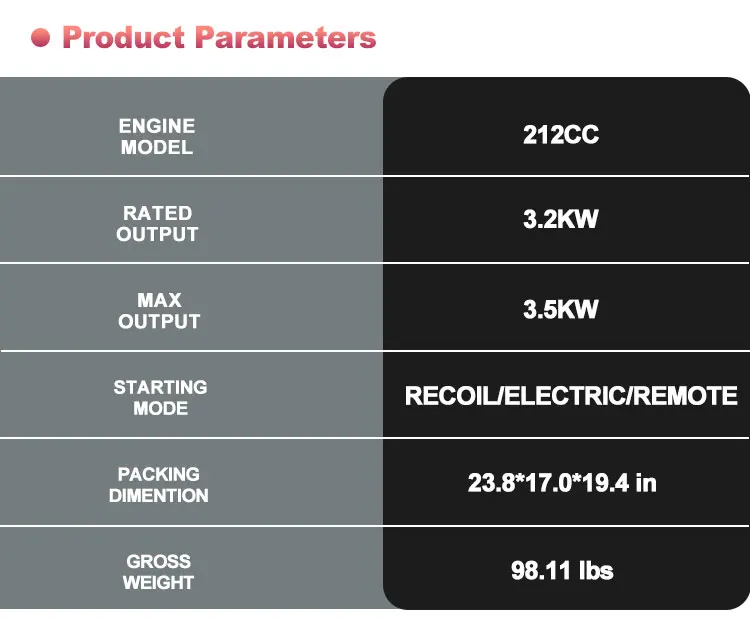 | Starting system | Recoil Start, Auto Start, remote start | Engine Type | 4-Stroke, air-cooled gasoline engine |